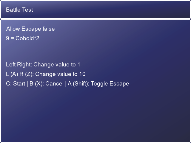 * Start Battle = allow play a test battle via the file "Troops.rxdata"