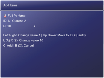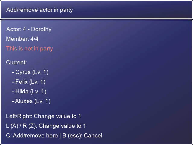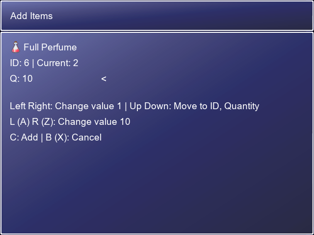 * Add items, weapons, armor, currency, level, actor = adds/removes current items/levels with new values